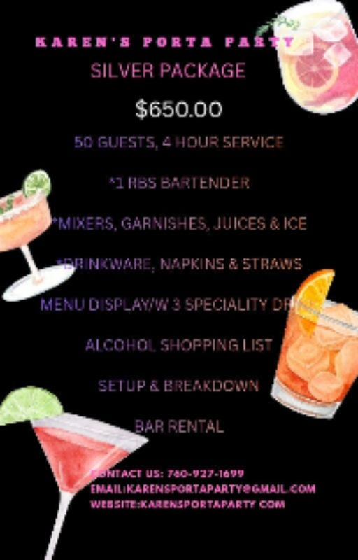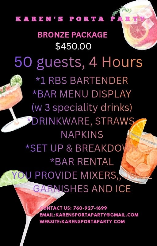 Let's discuss your event and create a custom bar package that exceeds your expectations. Contact Karen's Porta Party today!